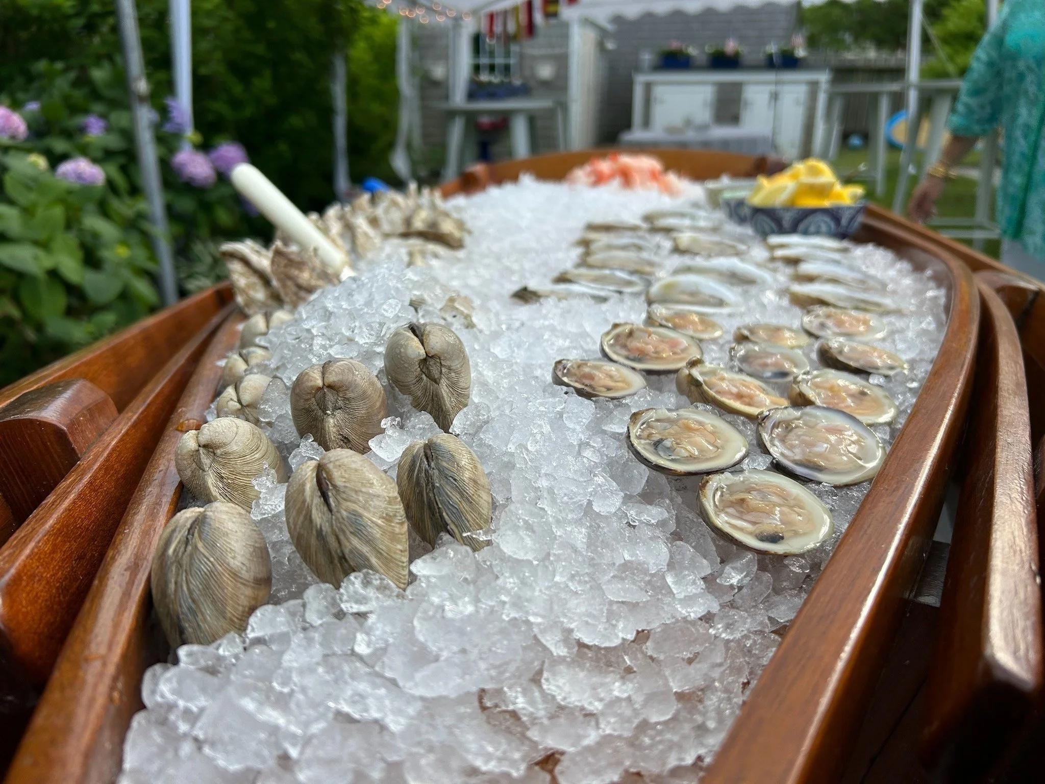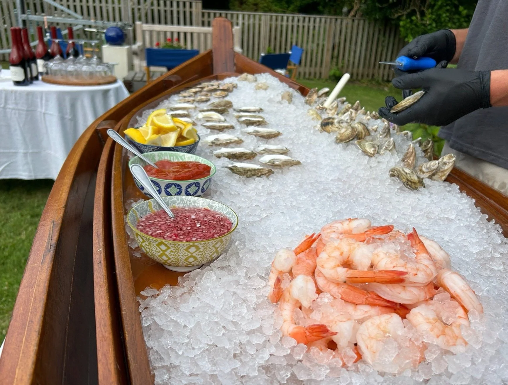 Complete with our signature dory boat table, we will provide oysters, littlenecks, shrimp, ice, supplies for shucking, lemons, and sauces. We bring buckets for all of the shells to make it a hassle-free experience for you as a host.
